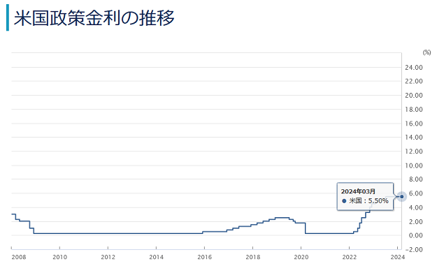 アメリカはコロナ禍で高いインフレ率に見舞われ、政策金利を上げて景気の過熱を抑制してきました。2022年3月それまで0.25%だった金利を0.5%に引き上げ、以降加速度的に引き上げ今は5.5%まで上昇しています。