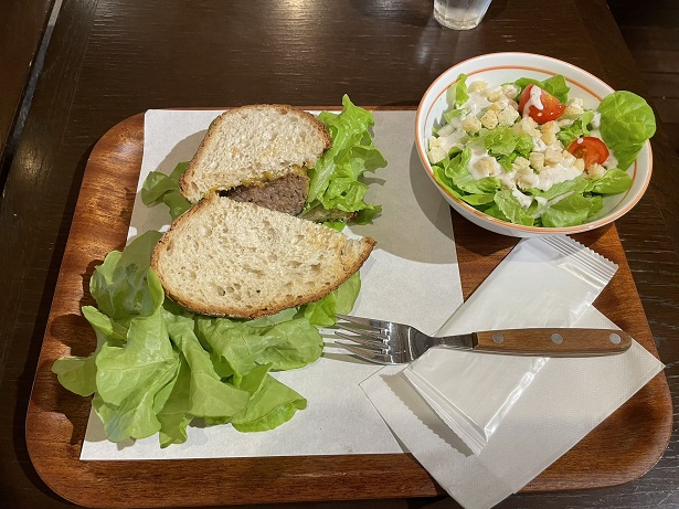 ハンバーグサンドセット(1300円)です。これにコーヒーが付きます。ハンバーグがしっかりしていてとても美味しいです。