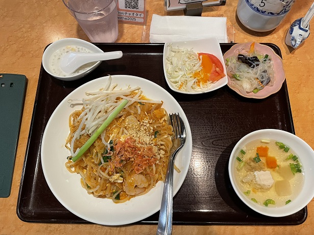頼んだのはパッタイ(1210円)タイ風焼きそばです。エビ入りの具沢山で甘い味付けでした。日本のソース焼きそばとは随分違うと思いました。スープと漬物がとても美味しかったです。