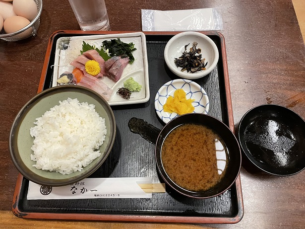 頼んだのは刺身定食(1000円)です。中とろ入りで値段の割に中々のクオリティだったと思います。ご飯、味噌汁はお替り自由です。