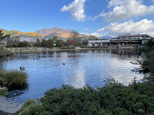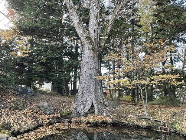 反対側から見た鯉の池で、先程の展望デッキが見えます。