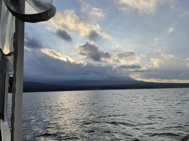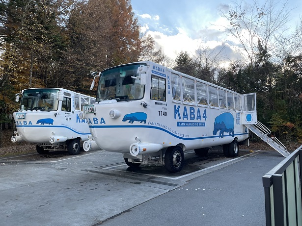 カババスは水陸両用バスです。運転には大型2種の他船舶の免許も必要だそうです。窓はビニールシートですが皆開けていました。私も開けていましたが結構寒かったです。山中湖は標高が1000近いのでそれもそのはずです。