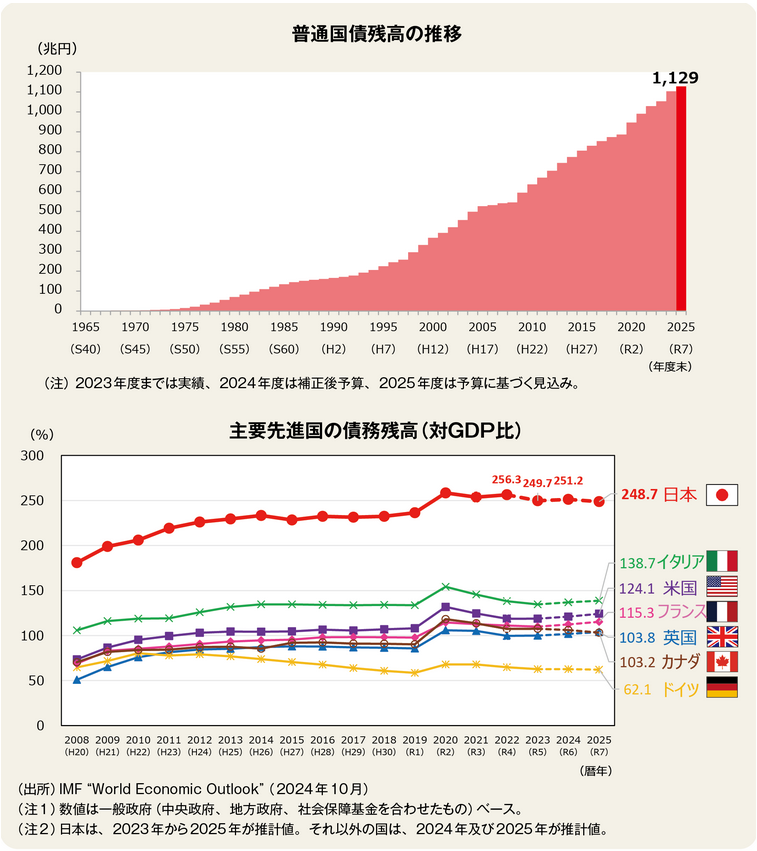財務省が公表している普通国債残高推移と主要先進国の債務残高(対GDP比)です。日本は先進国の中で突出して高いのが分かります。2025年3月末時点の国債残高は1054兆4760億円で、そのうち日銀は545兆5980億円と51.7%を担っています。