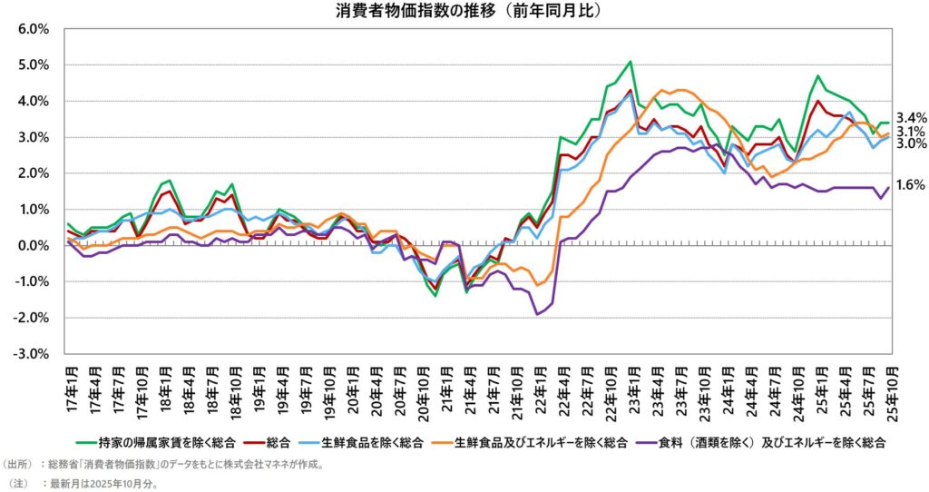 前年度比の消費者物価指数がこれです。2025年10月の消費者物価指数は以下のごとくです。