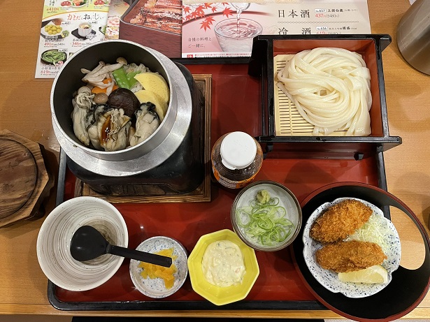 注文したのは広島産牡蠣の釜めし御膳カキフライセット(1860円)、うどん大盛(170円)です。うどんは2段になってました。久しぶりに釜めしを食べてみましたがやはり美味しかったです。まさに牡蠣尽くしで広島の厳島神社へ行った時のことを思い出しました。