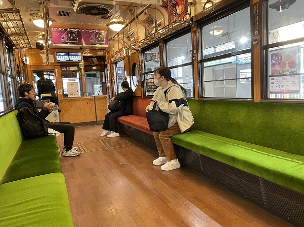 嵐電で嵐山に向かいます。とても綺麗で素敵な電車でした。