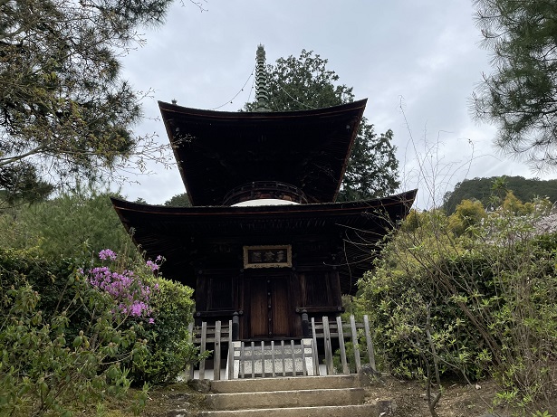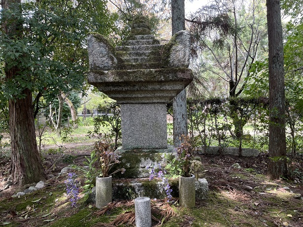 源融の墓です。源融は嵯峨天皇の第12皇子で光源氏のモデルと言われています。本堂の隣の阿弥陀堂には平安時代源融の山荘「棲霞観」が建っており、嵯峨院の一画でした。この棲霞観の位置が、源融が光源氏のモデルだとする根拠の一つで、光源氏によって建立されたとする「嵯峨の御堂」は「松風」の巻に「大覚寺の南のほうにある」と記述があり、これは棲霞観の位置にぴったり一致しています。