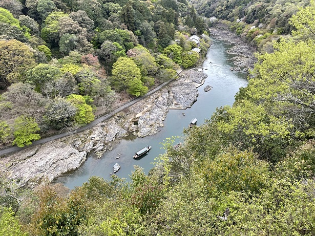 コーヒーを飲んだ後嵐山公園の展望台に来ました。展望台から見下ろした大堰川の風景です。上が上流になり、向こう側に川に沿うように歩道があります。